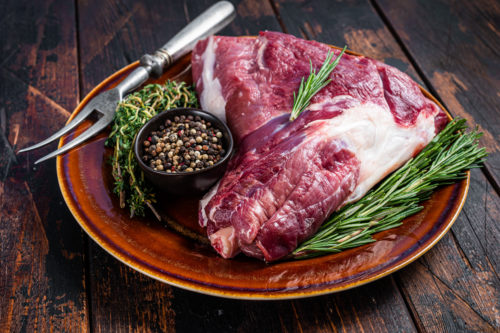 - Rub meat with Salt and Pepper, then cut small incisions into the meat and insert the garlic that’s cut into strips and rosemary, put cut potatoes and meat into one pan.